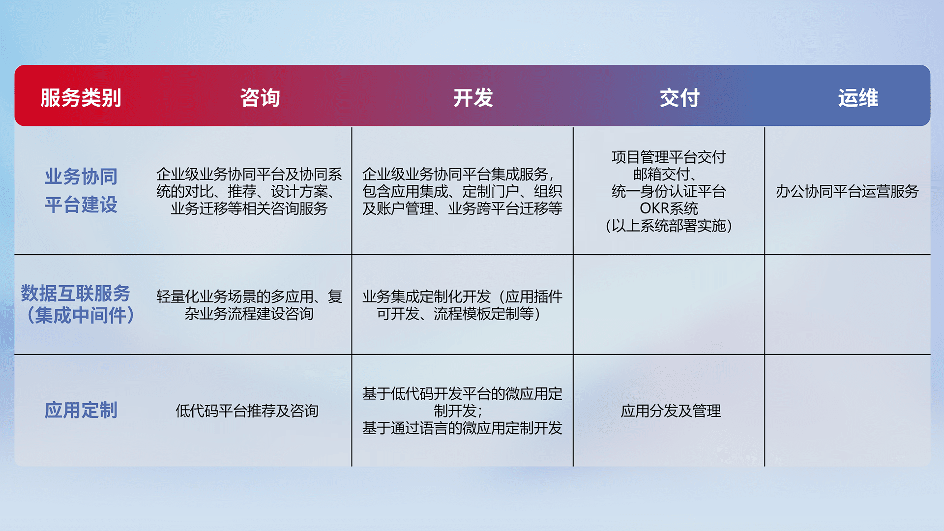 针对钉钉、、、企微、、、、IDaas等平台级产品提供产品的规划、、、、方案、、、交付、、定制化开发等服务,,,实现如统一协同办公、、智能客户服务、、、混合会议管理、、智能数据查询、、、、等业务场景,,实现数字化转型。。。